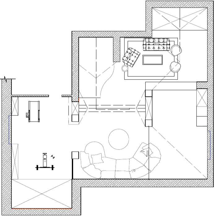 В центре- в основной части мансарды установили большой мягкий диван, и напротив экран для просмотра фильмов в большой и веселой компании. Места хватит для всех. Конечно аквариум и камин - неотъемлемые части этой необыкновенно теплой и уютной мансарды.